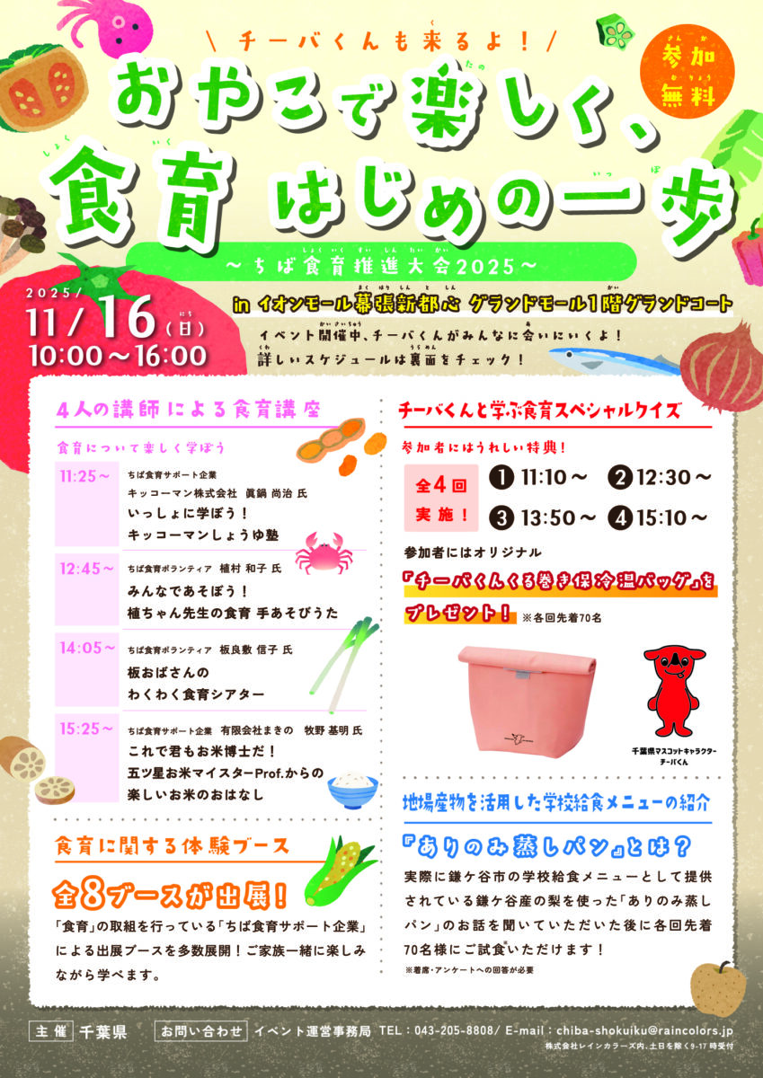 | お問い合わせ | 043-205-8808(株式会社レインカラーズ・土日を除く9-17時受付) chiba-shokuiku@raincolors.jp |