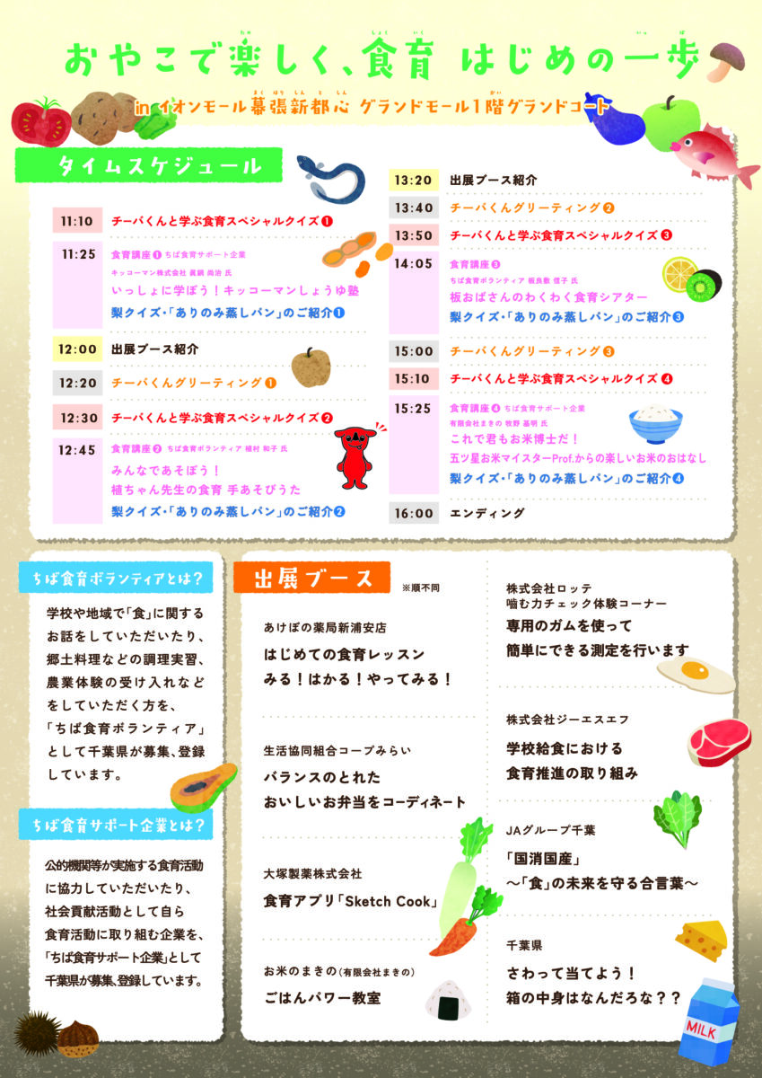 | イベント内容 | ①4人の講師による食育講座 ②チーバくんと学ぶ食育スペシャルクイズ ③食育に関する体験ブース ④地場産物を活用した学校給食メニューの紹介 |